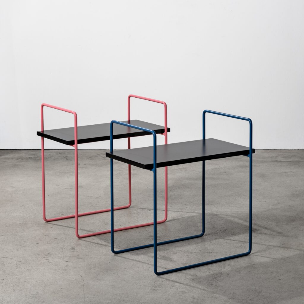As with the other models in the loop series, the name is inspired by the shape of its base, made of powder-coated steel, shown here in pink and petrol. The seat is made of Valchromat. Photo: Norbert Faehling